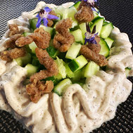 Raviole de volaille à la truffe mésentérique et réduction de batavia