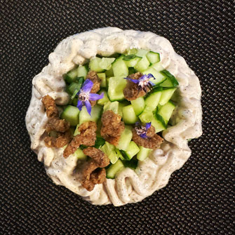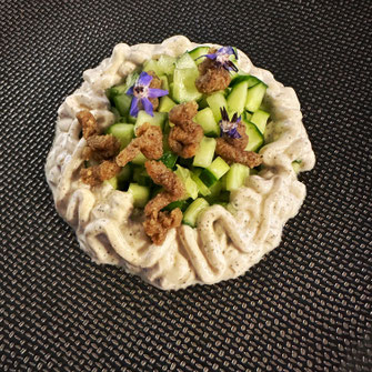 - Prendre deux yaourt de brebis et les vider dans un bol. Ajouter un peu d'huile d'olive. Bien remuer. Saler et poivrer. Ajouter la truffe en poudre lyophilisée. Puis réserver.